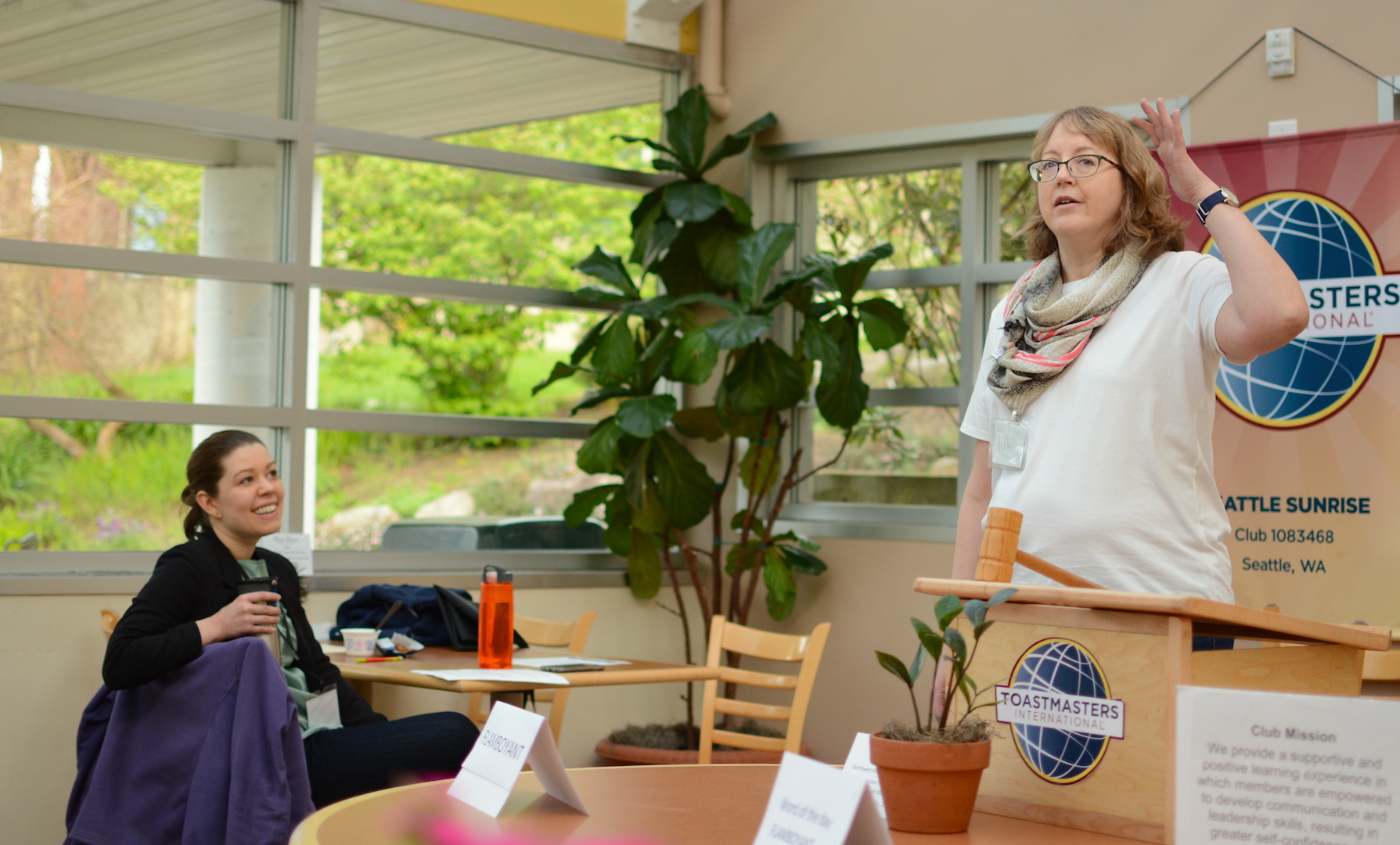 Aanya L. led the table topics portion of the meeting with original improv exercises where two members of the audience are given a situation and prompts to create creative small talk. Dilip and Isabella were voted best table topic for their easy banter about flowers and broken cycling equipment at the gym.