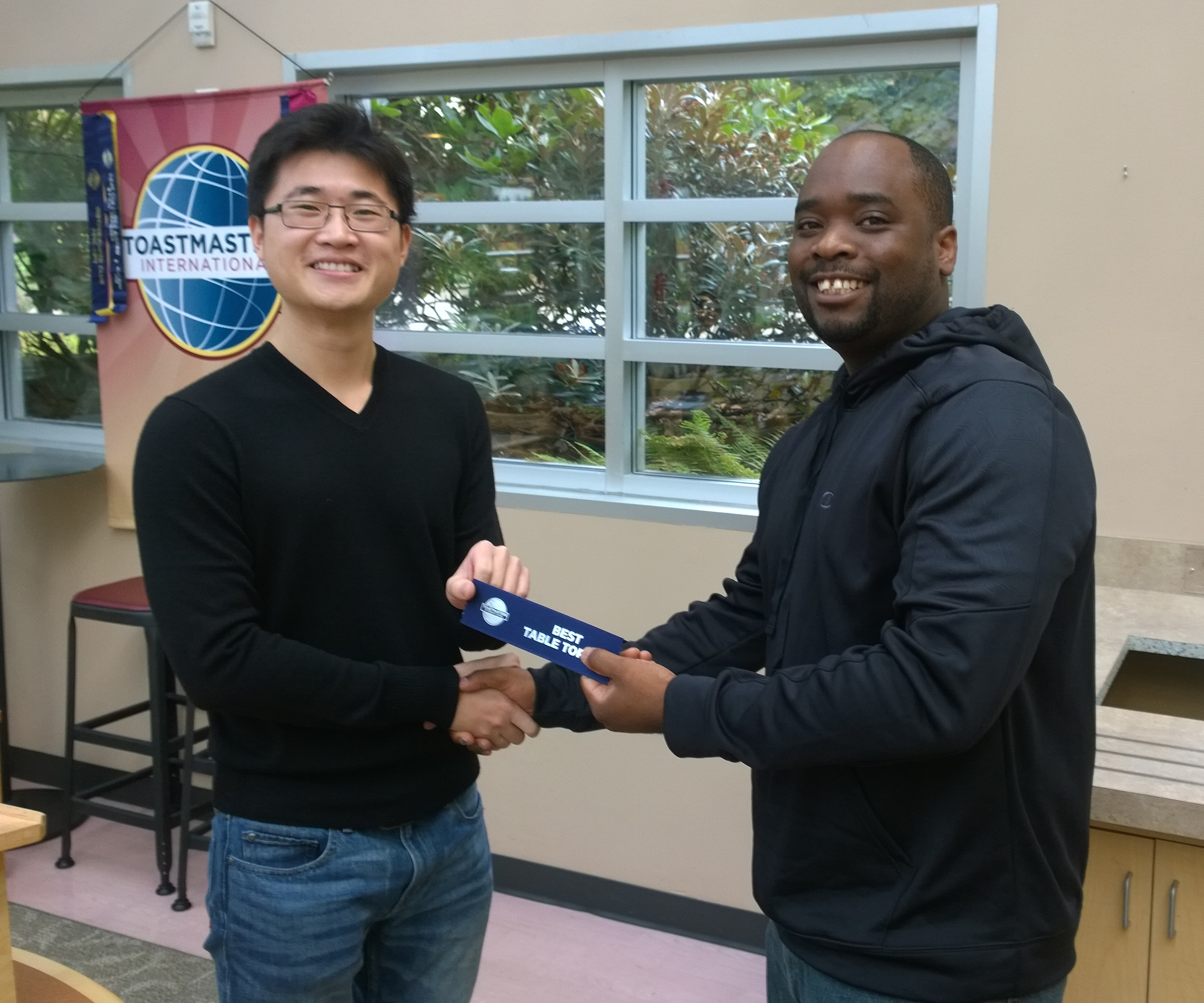 Aviary Photo_130575621368713103President Shen Yang presented the Best Table Topics Award to the meeting’s lone guest (whose picture I was able to capture, but whose name has somehow escaped my note-taking…sorry!!!), and the Best Evaluator Award to Michelle Delappe. (There is a rumor that Michelle has quite her job to sew a queen-sized quilt with all her ribbons.)