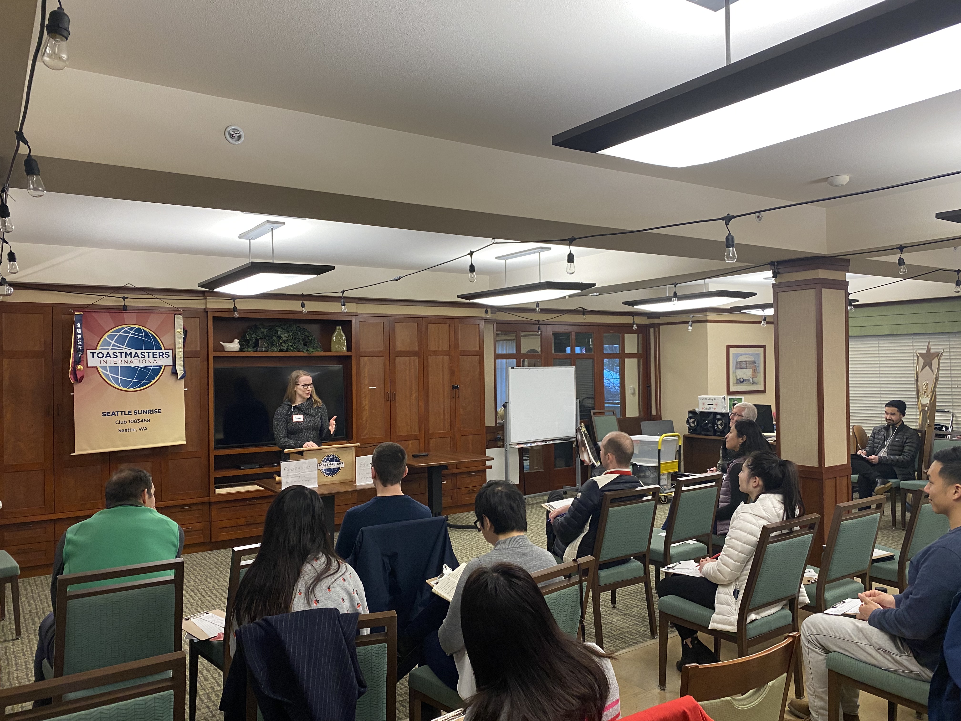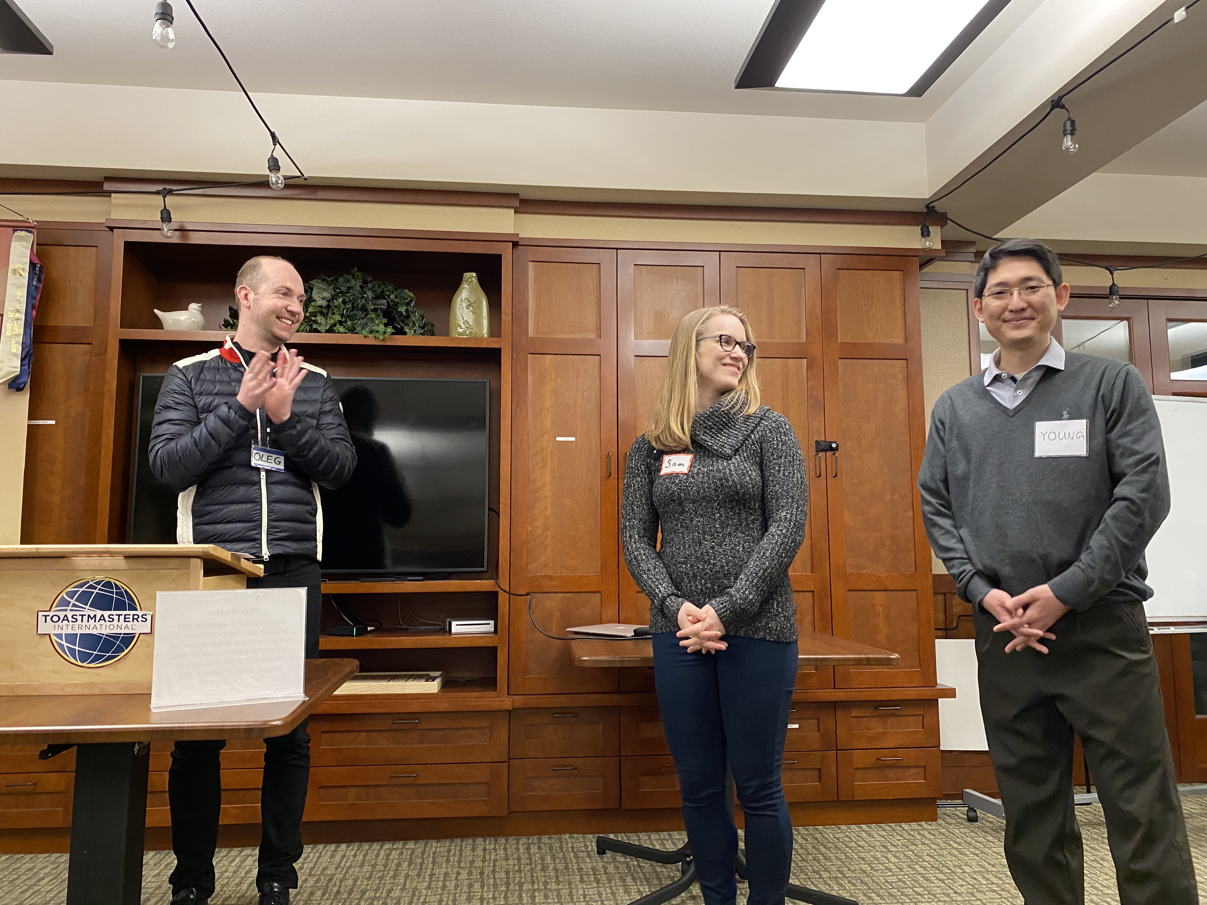 We inducted our first two new members to Seattle Sunrise for year 2020.  Oleg inducted Samatha and Young, welcoming them to the club as members, and asking them four questions: 1.Will you prepare for your assignments to the best of your ability? 2.    Will you cheerfully accept the roles assigned to you? 3.    Will you support and encourage others in their speaking goals? 4.    Will you attend regularly?  Then Oleg reminded the club members of their commitment asking them “As club members, do you agree to support Samatha and Young in their growth as a speaker,  leader and club member?”  Toastmaster club provide a supportive and positive learning experience in which members are empowered to develop communication and leadership skills, resulting in greater self-confidence and personal growth.