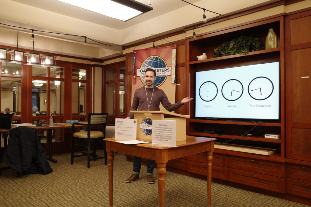 The first speaker Oleg provided a show-and-tell speech about Pathway Base Camp on the Toastmaster.org website and how to navigate. It was small bite size education, pertinent, and very helpful speech for the members of the Club. Our most improved speaker of the year might just be Isabella. As the second speaker, she gave us a retrospective on her journey in Toastmaster, in Pathways, and how it improved her communication and confidence at work and personally. Designer by trade, Isabella definitely designed a wonderful speech for us to experience. It was speech of culmination and retrospective, sharing with vulnerability, self deprecating humor, and relevant details, of how her journey at Toastmaster had dramatically help her. Traci evaluating Isabella commented on her “pausing” and “slowing” down in her delivery, asking her to do more of this and to connect more with the audience, while celebrating the improvements and the messages she presented in her speech. With poise and composure, Jimmy described how train travel put the world on the same clock. Using simple power point visual aid and the power of his words, Jimmy took us on a journey of how the railroads create the first time zones. In Scott’s evaluation of Jimmy’s speech, he mentioned that the narrative arch was enjoyable. Connecting the Toastmaster early meeting time to the thesis of the presentation, Jimmy was able to hook us to the topic. Both speaker and evaluator were polished in their delivery, and it was fantastic for the audience to have Jimmy and Scott finished each of their respective section. Scott won the Best Evaluator award. Our returning guest, Jason, won the best Impromptu Speech for the Table Topics.