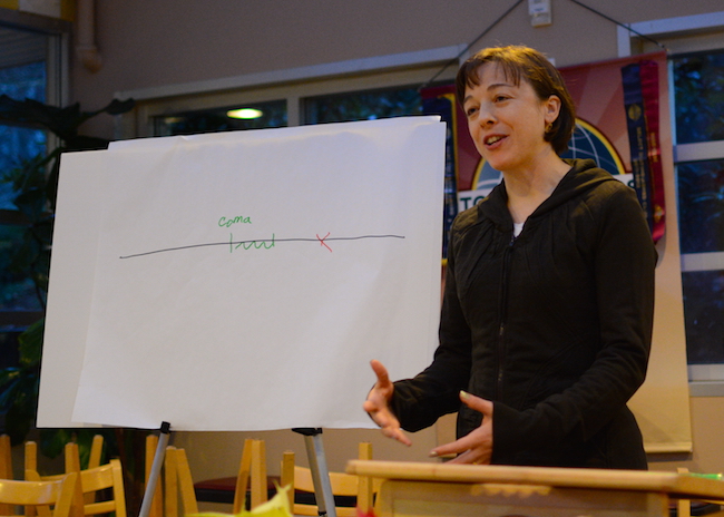 Michelle started things off with, “Time to Make a Plan,” her CC Project #8 “Get Comfortable with Visual Aids.” In the speech Michelle reached into her legal briefs to discuss the importance of making a will. The speech moved at least one Toastmaster in the group (yep, that would be me) to make sure all the proverbial “I’s” and “T’s” were dotted and crossed on his will.
