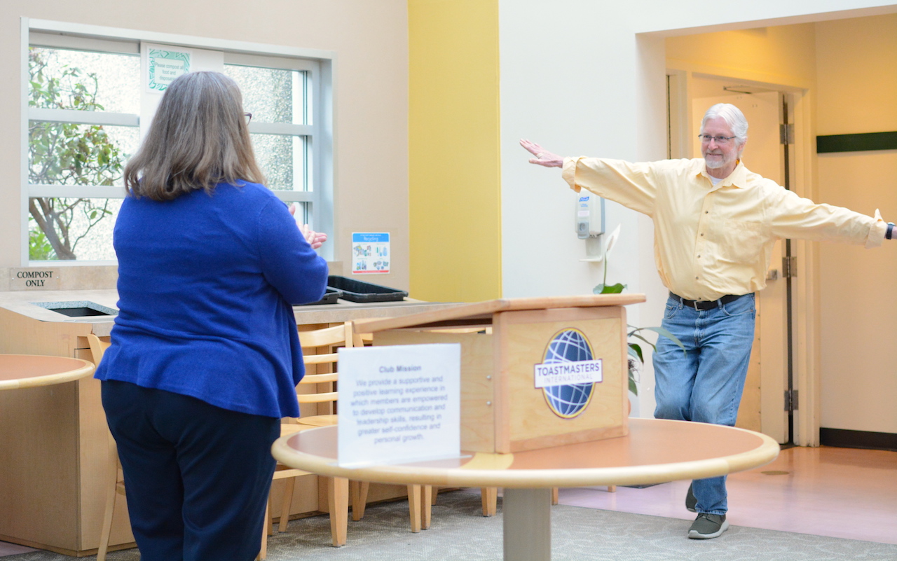 Bill S. presented project #10 from the CC Manual- ” My history of flight” . This was a repeat and improved presentation of this this lively and inspirational speech. Using expressive body language, Bill shared his fascinating ability to fly in his sleep. What’s most surprising: this skill does not come any easier in the dream world; it takes training, dedication and fearlessness… just like the ability to speak in public! Bill encouraged the audience to keep spreading their wings by coming to Toastmasters .