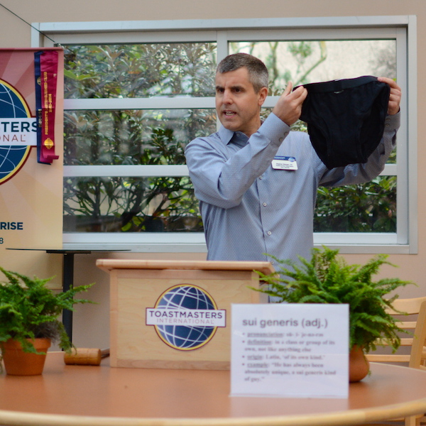 Steve, demonstrating a Toastmasters advance manual project of “Warming the Audience Up” with a talk about… Undies. He showed boxers. He showed briefs. Then, he showed something that was orange colored, too. Yes, Steve introduce a perhaps taboo discussion of underwear with subtly and comedy. It was humorous, informative, and broke boundaries of comfort zones. Steve wants to expand his speech, so if you have any suggestions for him, send him an email.