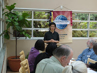 - Speechcrafter Mineko gave her second speech, “Stage Fright.” She described the symptoms of fear of public speaking and offered suggestions on overcoming this paralysis. These included not only the tried-and-true technique of deep breathing, but consciously expanding our peripheral vision as a way to banish panic.