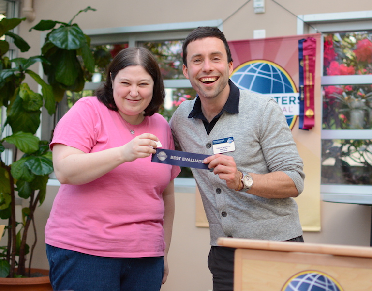 We moved directly into the evaluations for the speeches, with Katey N, Steve W, Marti M, and Michelle D providing feedback to the four speakers and Tina H serving as General Evaluator. Katey won the ribbon for Best Evaluator for her feedback on Scott’s speech. Congratulations, Katey!
