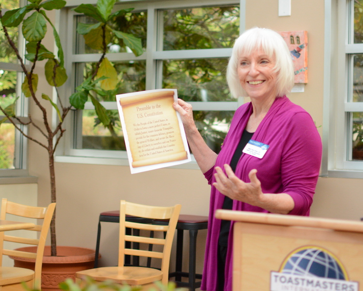 Table Topics Master Marti brought out a copy of the Preamble of the Constitution to serve as inspiration for Table Topics. She had six speakers Nicole C., Valerie, Mary, and Brett, and our two guests, Amy and Sarah, riff on several of the founders’ famous phrases about liberty and justice, etc. Sarah walked away with the Best Table Topics ribbon.